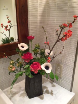 ぼけ、アネモネ、ラナンキュラス、豆の花、スプレーバラ、松