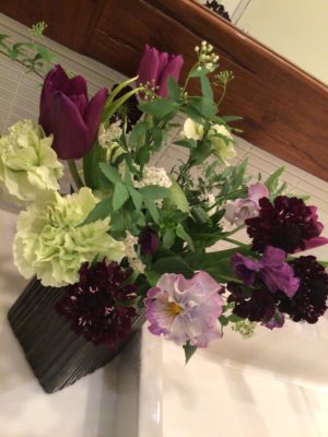 チューリップ、パンジー、カーネーション、コデマリ、スカビオサ
