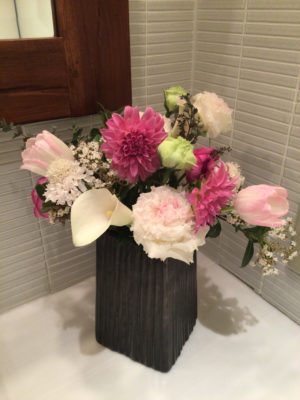 チューリップ、ダリア、カラー、トルコキキョウ、スカビオサ、ガマズミ、ユーカリ